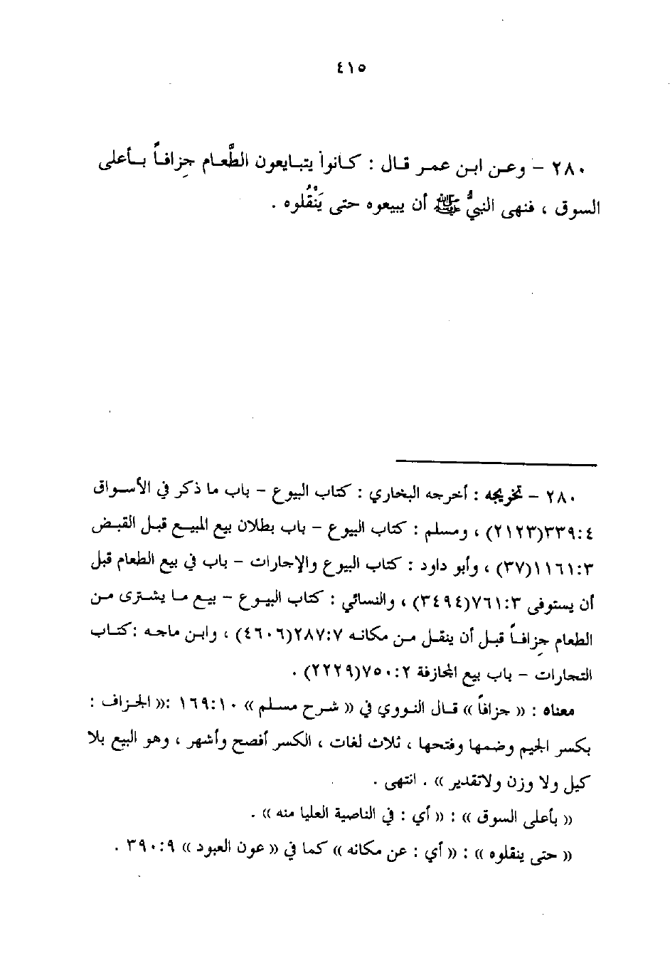 280 - وعن ابن عمر قال: كانوا يتبايعون الطَّعام جِزافًا بأعلى السوق، فنهى النبيُّ - صلى الله عليه وسلم - أن يبيعوه حتى يَنْقُلوه.