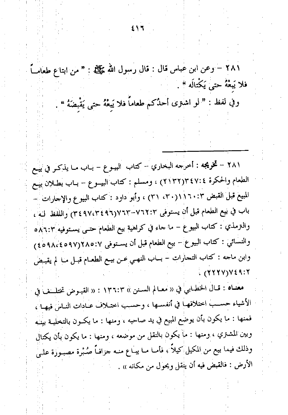 281 - تخريجه: أخرجه البخاري - كتاب البيوع - باب ما يذكر في بيع الطعام والحكرة 4: 347 (2132)، ومسلم: كتاب البيوع - باب بطلان بيع المبيع قبل القبض 3: 1160 (30، 31)، وأبو داود: كتاب البيوع والإجارات - باب في بيع الطعام قبل أن يستوفى 3: 762 - 763 (3497، 3496) واللفظ له، والترمذي: كتاب البيوع - ما جاء في كراهية بيع الطعام حتى يستوفيه 586: 3 والنسائي: كتاب البيوع - بيع الطعام قبل أن يستوفى 7: 285 (4598، 4597) وابن ماجه كتاب التجارات - باب النهي عن بيع الطعام قبل ما لم يقبض 2: 749 (2227).
