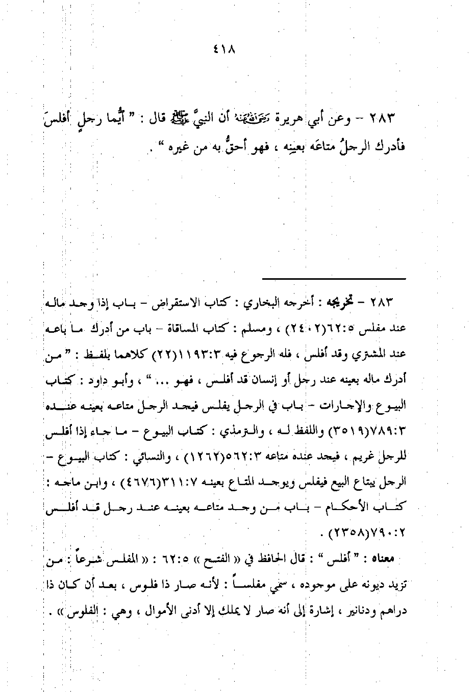 283 - وعن أبي هريرة - رضي الله عنه - أن النبيَّ - صلى الله عليه وسلم - قال: "أيُّما رجلٍ أفلسَ فأدرك الرجلُ متاعَه بعينِه، فهو أحقُّ به من غيره".