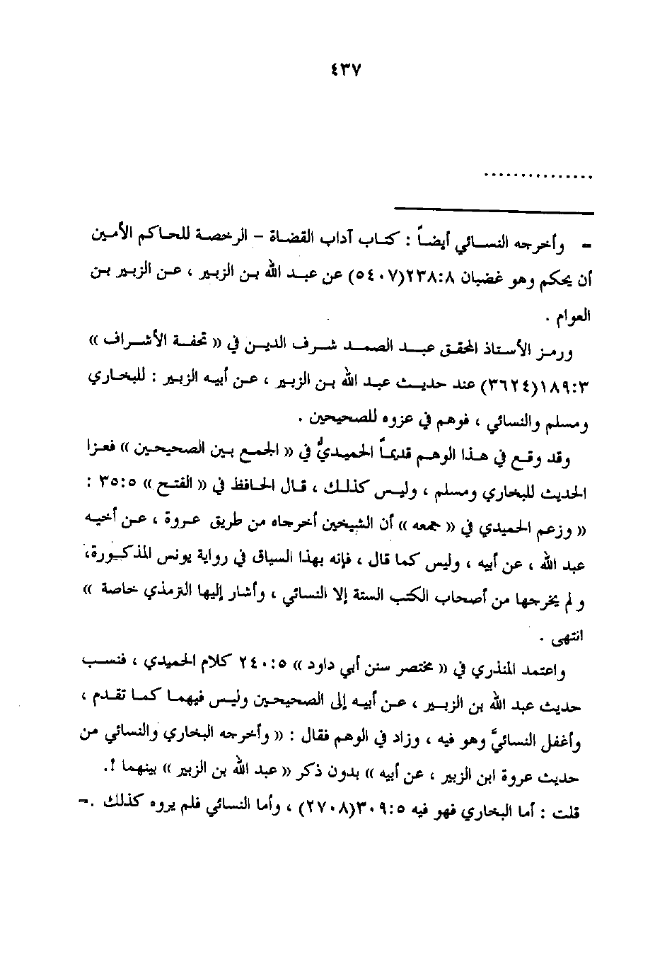 واعتمد المنذري فِي "مختصر سنن أبي داود" 5: 240 كلام الحميدي، فنسب حديث عبد الله بن الزبير، عن أبيه إلى الصحيحين وليس فيهما كما تقدم، وأغفل النسائي وهو فيه، وزاد فِي الوهم فقال: "وأخرجه البخاري والنسائي من حديث عروة ابن الزبير، عن أبيه" بدون ذكر "عبد الله بن الزبير" بينهما!.