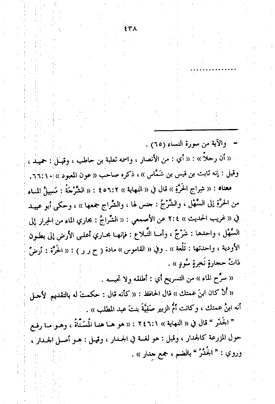 معناه: "شِراج الحَرَّةِ" قال فِي "النهاية" 2: 456: "الشَّرْجَةُ: مَسِيلُ الماء من الحرَّةِ إلى السَّهْل، والشَّرْجُ: جنس لها، والشِّراج جمعها"، وحكى أبو عبيد فِي "غريب الحديث" 4: 2 عن الأصمعي: "الشِّراجُ: مجاري الماء من الحِرار إلى السَّهْل، واحدها: شَرْجٌ، وأما التِّلاع: فإنها مجاري أعلى الأرض إلى بطون الأودية، واحدتها: تَلْعة". وفي "القاموس" مادة (ح ر ر): "الحَرَّة: أرضٌ ذاتُ حجارةٍ نَخِرةٍ سُودٍ".