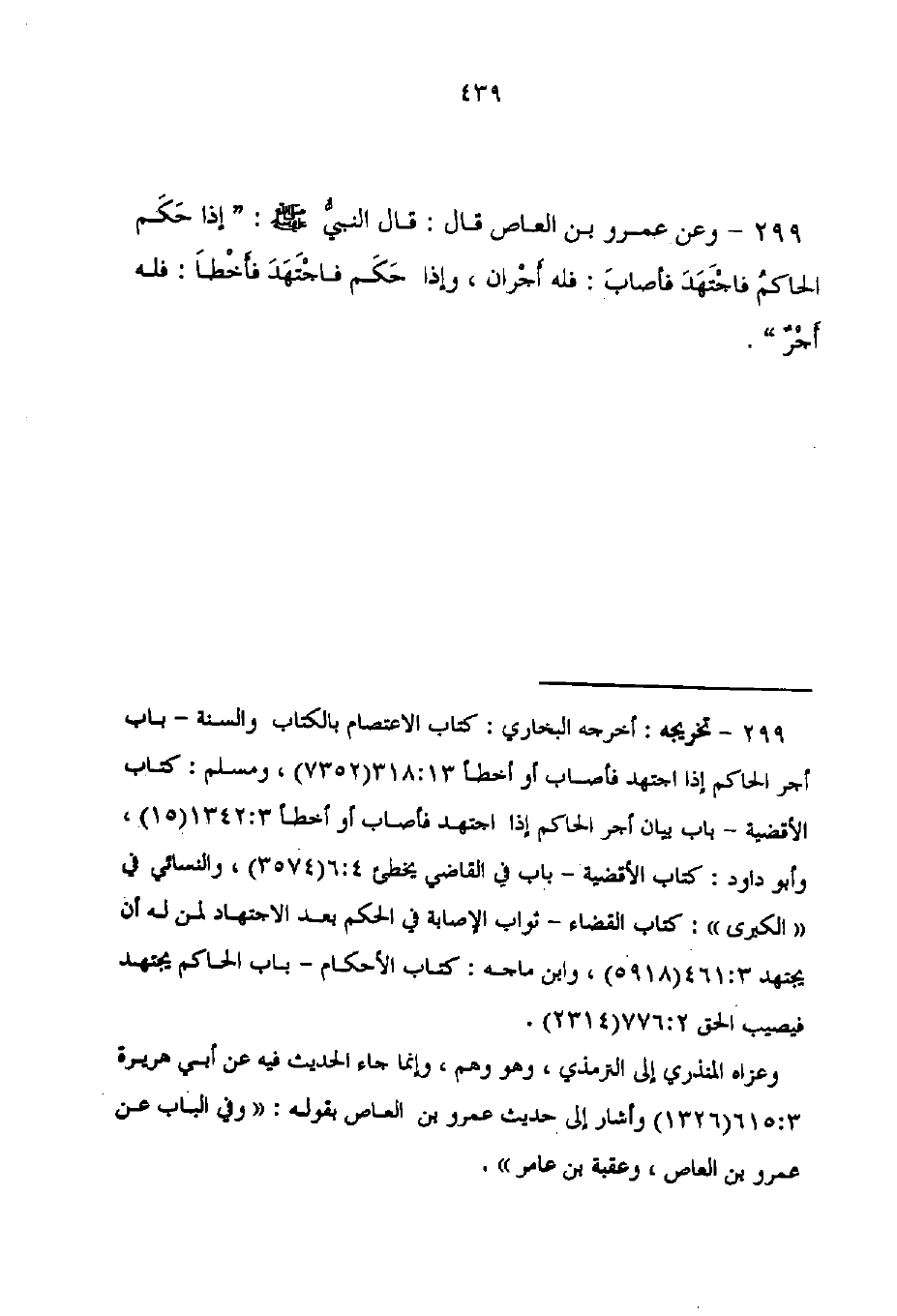 299 - وعن عمرو بن العاص قال: قال النبيُّ - صلى الله عليه وسلم -: "إذا حَكَم الحاكمُ فاجْتَهَدَ فأصابَ: فله أَجْران، وإذا حَكَم فاجْتَهَدَ فأَخْطَأ: فله أَجْرٌ".