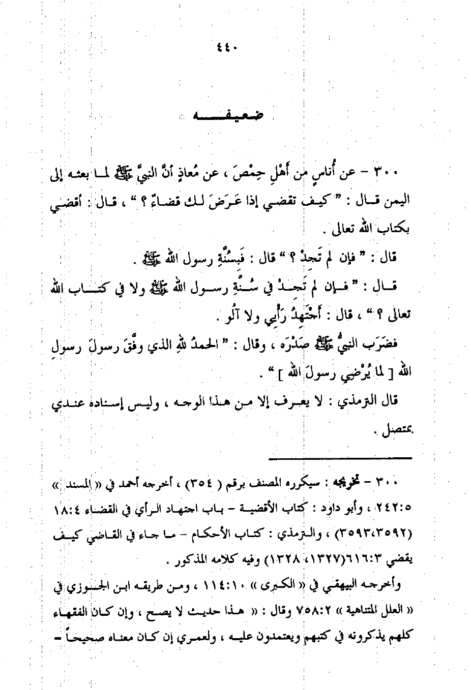 300 - تخريجه: سيكرره المصنف برقم (354)، أخرجه أحمد في "المسند" 5: 242، وأبو داود: كتاب الأقضية - باب اجتهاد الرأي فِي القضاء 18: 4 (3593، 3592)، والترمذى: كتاب الأحكام - ما جاء فِي القاضي كيف يقضي 3: 616 (1327، 1328) وفيه كلامه المذكور.