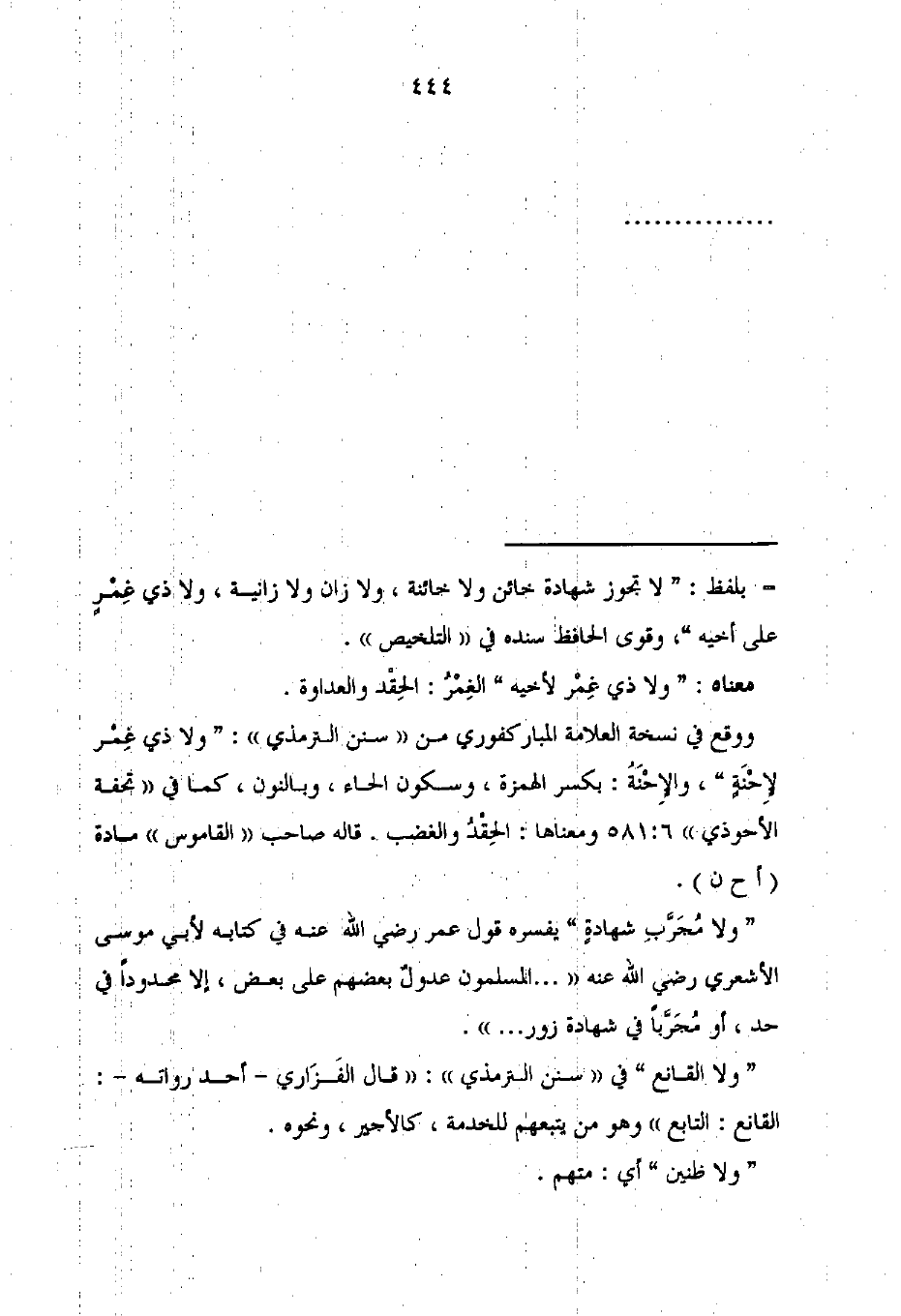"ولا مُجَرَّبِ شهادةٍ" يفسره قول عمر - رضي الله عنه - فِي كتابه لأبي موسى الأشعري - رضي الله عنه - ". . . المسلمون عدولٌ بعضهم على بعض، إلا محدودًا فِي حد، أو مُجَرَّبًا فِي شهادة زور. . . .".