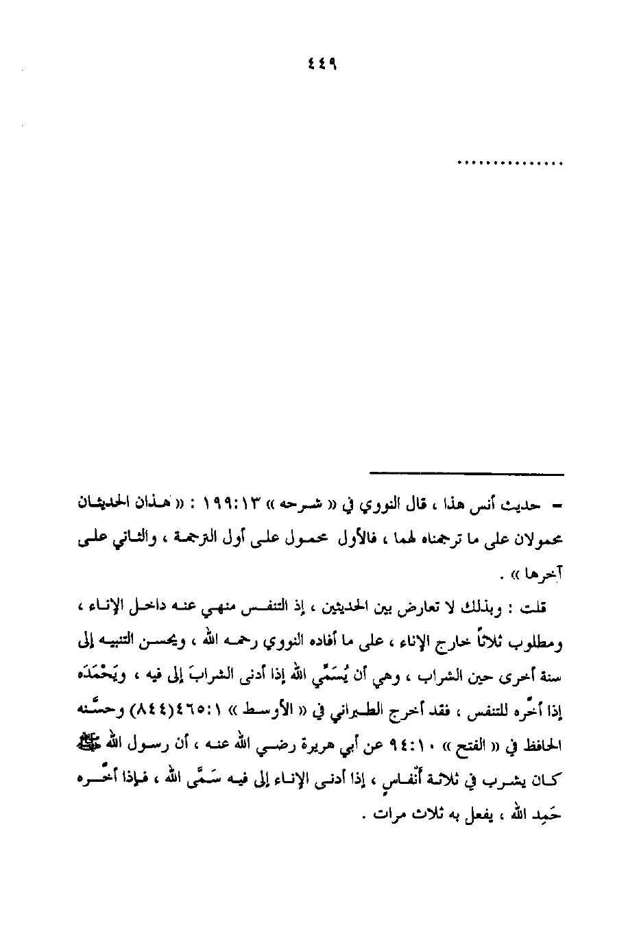 قلت: وبذلك لا تعارض بين الحديثين، إذ التنفس منهي عنه داخل الإناء، ومطلوب ثلاثًا خارج الإناء، على ما أفاده النووي رحمه الله، ويحسن التنبيه إلى سنة أخرى حين الشراب، وهي أن يُسَمِّي الله إذا أدنى الشرابَ إلى فيه، ويَحمَدَه إذا أخَّره للتنفس، فقد أخرج الطبراني فِي "الأوسط" 1: 465 (844) وحسَّنه الحافظ فِي "الفتح" 10: 94 عن أبي هريرة - رضي الله عنه -، أن رسول الله - صلى الله عليه وسلم - كان يشرب فِي ثلاثة أنفاسٍ، إذا أدنى الإناء إلى فيه سَمَّى الله، فإذا أخَّره حَمِد الله، يفعل به ثلاث مرات.