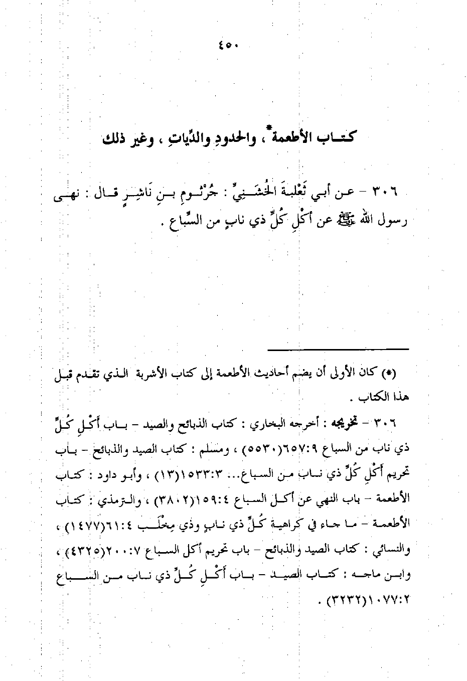 306 - عن أبي ثَعْلبةَ الخُشَنِيِّ: جرْثومِ بنِ نَاشِرٍ قال: نهى رسول الله - صلى الله عليه وسلم - عن أكْلِ كُلِّ ذي نابٍ من السِّباع.