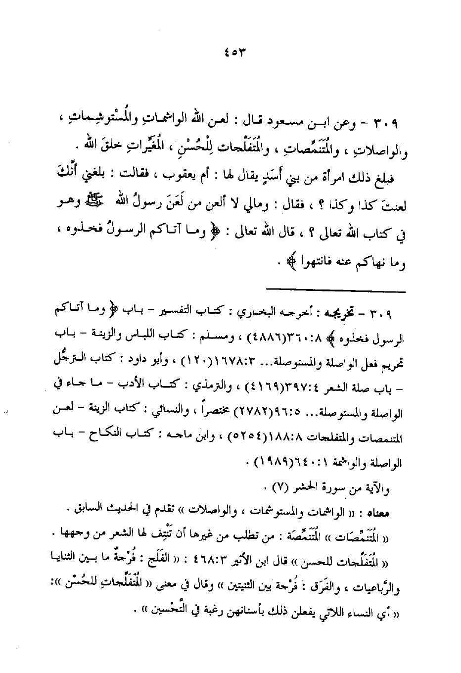 309 - تخريجه: أخرجه البخاري: كتاب التفسير - باب {وَمَا آتَاكُمُ الرَّسُولُ فَخُذُوهُ} 8: 360 (4886)، ومسلم: كتاب اللباس والزينة - باب تحريم فعل الواصلة والمستوصلة .... 3: 1678 (120)، وأبو داود: كتاب الترجُّل - باب صلة الشعر 397: 4 (4169)، والترمذي: كتاب الأدب - ما جاء فِي الواصلة والمستوصلة ... 5: 96 (2782) مختصرًا، والنسائي: كتاب الزينة - لعن المتنمصات والمتفلجات 188: 8 (5254)، وابن ماجه: كتاب النِّكَاح - باب الواصلة والواشمة 1: 640 (1989).