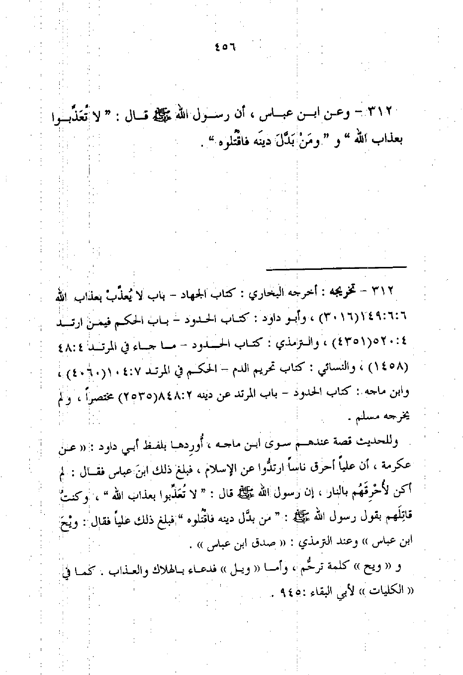 312 - تخريجه: أخرجه البخارى: كتاب الجهاد - باب لا يُعذَّبْ بعذاب الله 6: 6: 149 (3016)، وأبو داود: كتاب الحدود - باب الحكم فيمن ارتد 4: 520 (4351)، والترمذي: كتاب الحدود - ما جاء فِي المرتد 48: 4 (1458)، والنسائي: كتاب تحريم الدم - الحكم فِي المرتد 7: 104 (4060)، وابن ماجه: كتاب الحدود - باب المرتد عن دينه 2: 848 (2535) مختصرًا، ولم يخرجه مسلم.