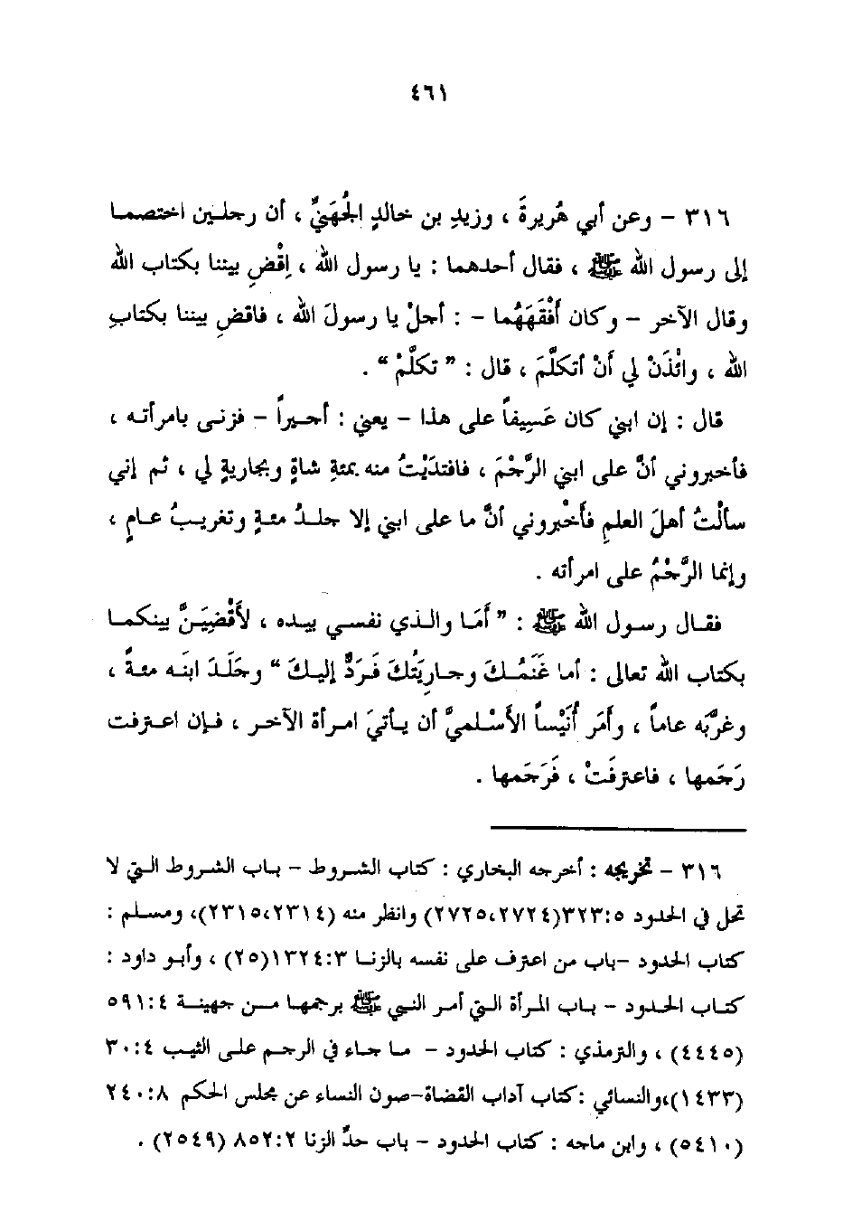 316 - تخريجه: أخرجه البخاري: كتاب الشروط - باب الشروط التي لا تحل في الحدود 5: 323 (2724، 2725) وانظر منه (2314، 2315)، ومسلم: كتاب الحدود - باب من اعترف على نفسه بالزنا 3: 1324 (25)، وأبو داود: كتاب الحدود - باب المرأة التي أمر النبي - صلى الله عليه وسلم - برجمها من جهينة 4: 591 (4445)، والترمذي: كتاب الحدود - ما جاء في الرجم على الثيّب 4: 30 (1433)، والنسائيُّ: كتاب آداب القضاة - صون النساء عن مجلس الحكم 8: 240 (5410)، وابن ماجه: كتاب الحدود - باب حدِّ الزنا 2: 852 (2549).
