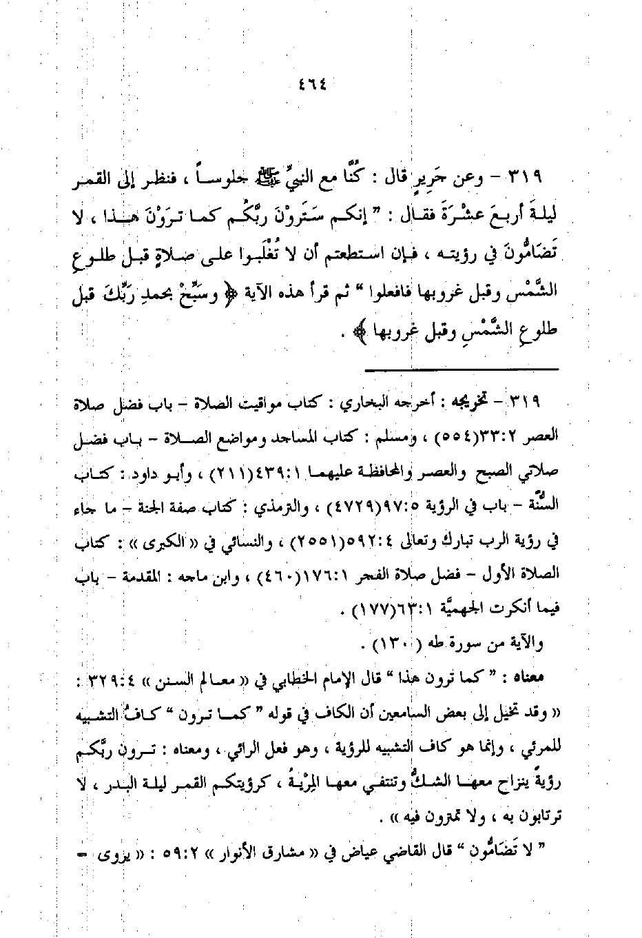 319 - وعن جَرِيرٍ قال: كُنَّا مع النبيِّ - صلى الله عليه وسلم - جلوسًا، فنظر إلى القمر ليلةَ أربعَ عشْرَةَ فقال: "إنكم سَتَروْنَ ربَّكُم كما ترَوْنَ هذا، لا تَضَامُّونَ في رؤيته، فإن استطعتم أن لا تُغْلَبوا على صلاةٍ قبل طلوعٍ الشَّمْس وقبل غروبها فافعلوا" ثمَّ قرأ هذه الآية {وَسَبِّحْ بِحَمْدِ رَبِّكَ قَبْلَ طُلُوعِ الشَّمْسِ وَقَبْلَ غُرُوبِهَا}.