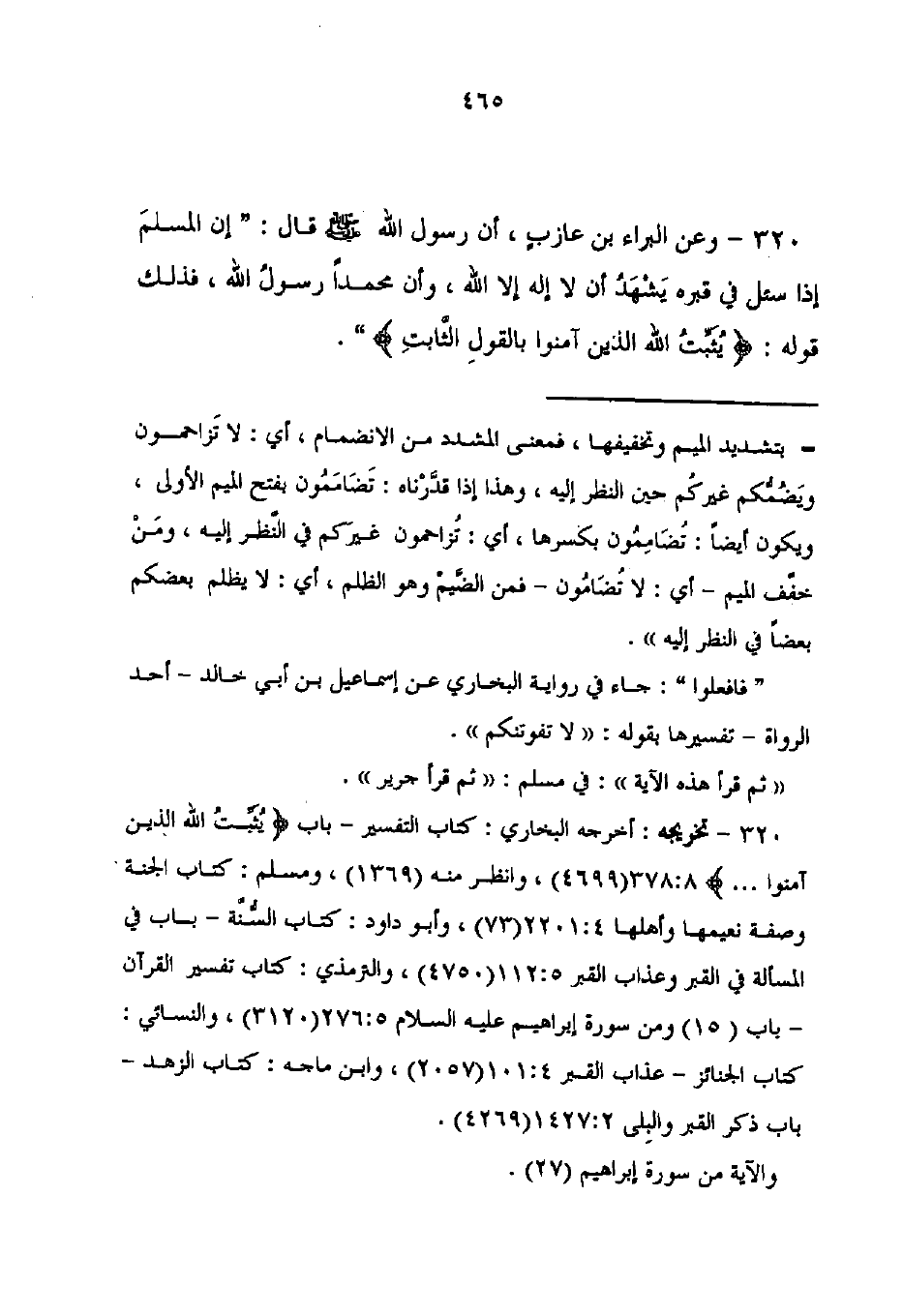 320 - تخريجه: أخرجه البخاري: كتاب التفسير - باب {يُثَبِّتُ اللَّهُ الَّذِينَ آمَنُوا. . .} 8: 378 (4699)، وانظر منه (1369)، ومسلم: كتاب الجنة وصفة نعيمها وأهلها 4: 2201 (73)، وأبو داود: كتاب السُّنَّة - باب في المسألة في القبر وعذاب القبر 5: 112 (4750)، والترمذي: كتاب تفسير القرآن - باب (15) ومن سورة إبراهيم عليه السلام 5: 276 (3120)، والنسائيُّ: كتاب الجنائز - عذاب القبر 4: 101 (2057)، وابن ماجه: كتاب الزهد - باب ذكر القبر والبِلى 2: 1427 (4269).