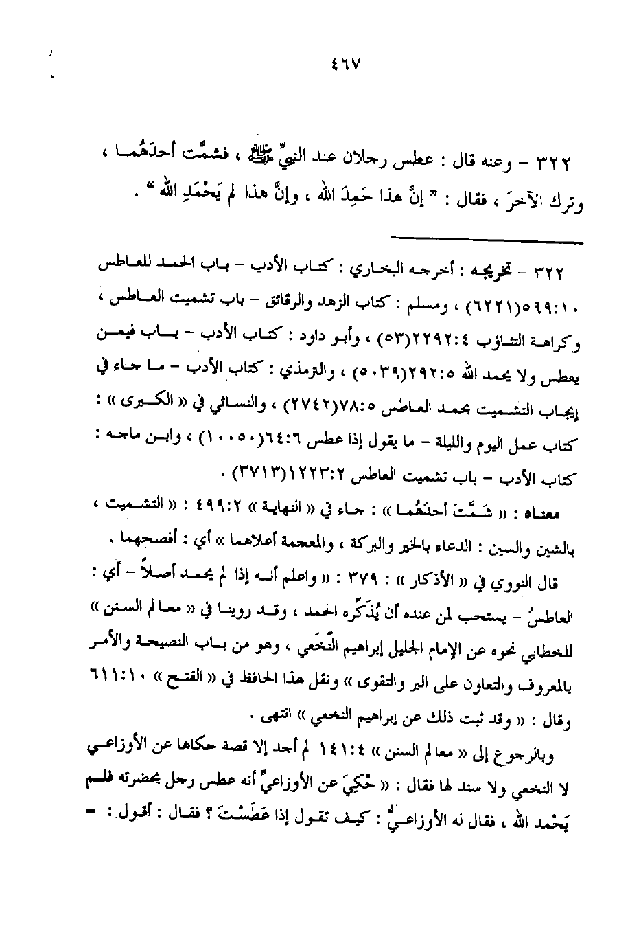 322 - تخريجه: أخرجه البخاري: كتاب الأدب - باب الحمد للعاطس 10: 599 (6221)، ومسلم: كتاب الزهد والرقائق - باب تشميت العاطس، وكراهة التثاؤب 4: 2292 (53)، وأبو داود: كتاب الأدب - باب فيمن يعطس ولا يحمد الله 5: 292 (5039)، والترمذي: كتاب الأدب - ما جاء في إيجاب التشميت بحمد العاطس 5: 78 (2742)، والنسائي في "الكبرى": كتاب عمل اليوم والليلة - ما يقول إذا عطس 6: 64 (10050)، وابن ماجه: كتاب الأدب - باب تشميت العاطس 2: 1223 (3713).