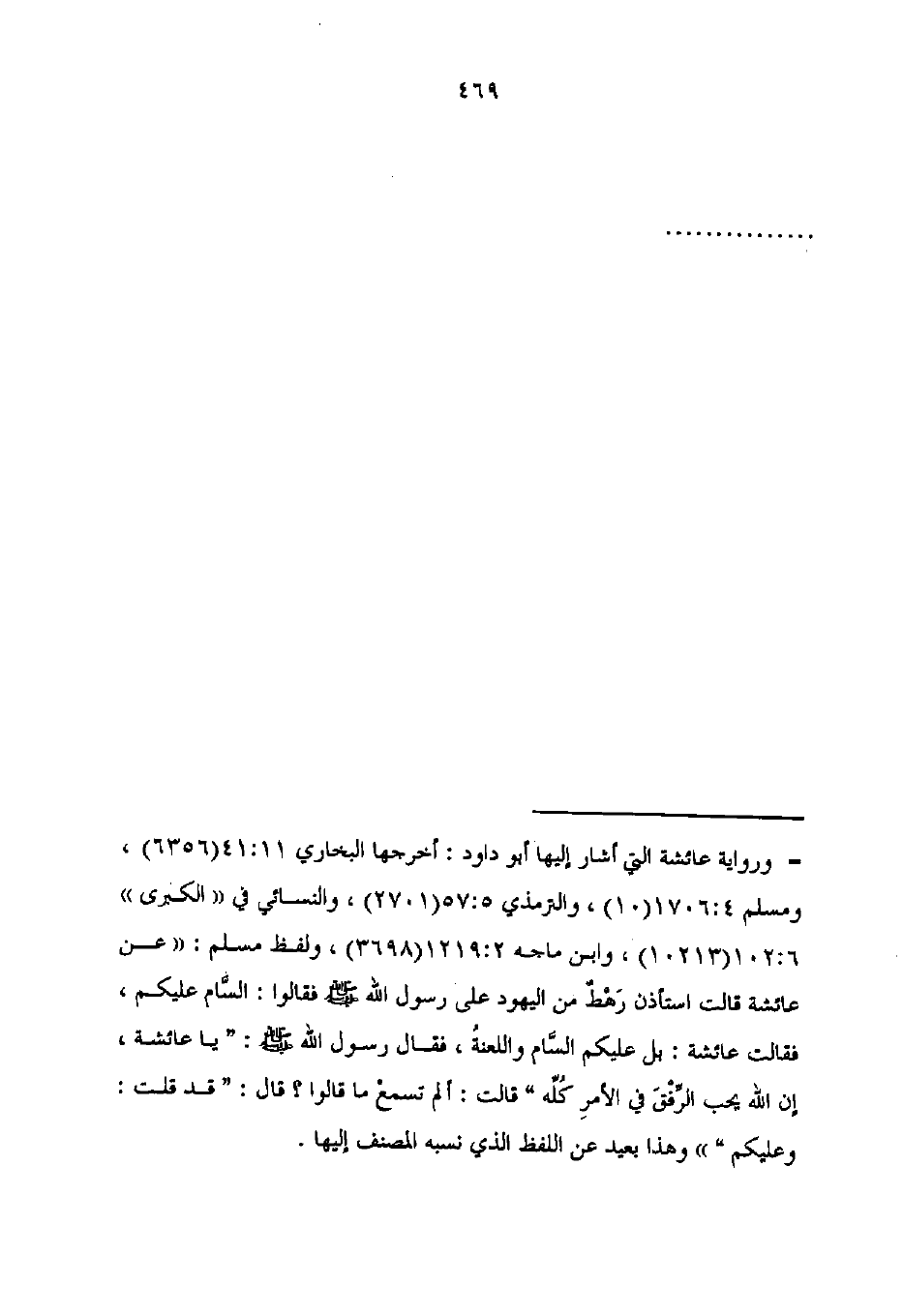 = ورواية عائشة التي أشار إليها أبو داود: أخرجها البخاري 11: 41 (6356)، ومسلم 4: 1706 (10)، والترمذي 5: 57 (2701)، والنسائيُّ في "الكبرى" 6: 102 (10213)، وابن ماجه 2: 1219 (3698)، ولفظ مسلم: "عن عائشة قالت استأذن رَهْطٌ من اليهود على رسول الله - صلى الله عليه وسلم - فقالوا: السَّام عليكم، فقالت عائشة: بل عليكم السَّام واللعنةُ، فقال رسول الله - صلى الله عليه وسلم -: "يا عائشة، إن الله يحب الرِّفْقَ في الأمرِ كُلِّه" قالت: ألم تسمع ما قالوا؟ قال: "قد قلت: وعليكم"" وهذا بعيد عن اللفظ الذي نسبه المصنف إليها.