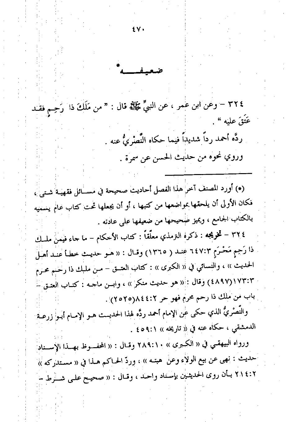 324 - تخريجه: ذكره الترمذي معلقًا: كتاب الأحكام - ما جاء فيمن ملك ذا رَحِمٍ مَحْرَمٍ 3: 647 عند (1365) وقال: "هو حديث خطأ عند أهل الحديث"، والنسائيُّ في "الكبرى": كتاب العتق - من ملك ذا رحم محرم 3: 173 (4897) وقال: "هو حديث منكر"، وابن ماجه: كتاب العتق - باب من ملك ذا رحم محرم فهو حر 2: 844 (2525).
