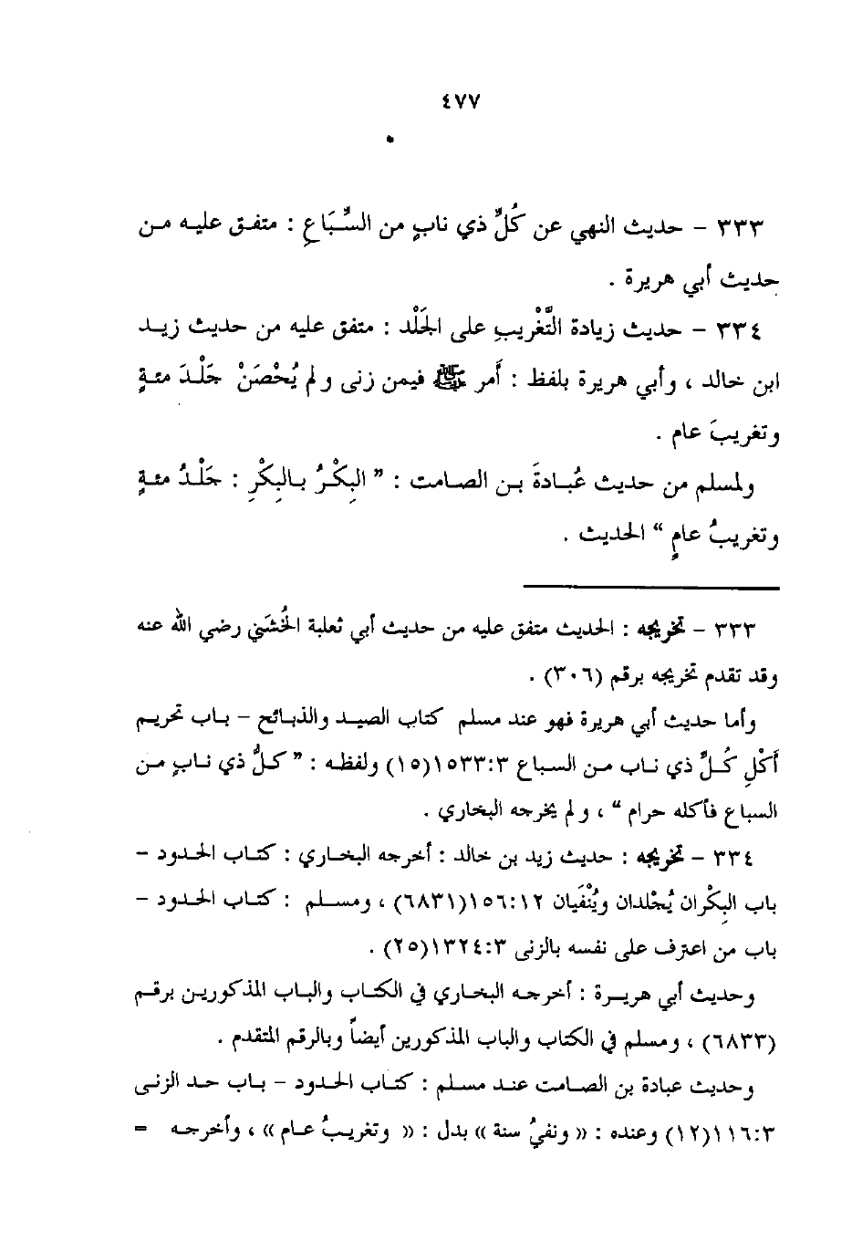 334 - حديث زيادة التَّغْريبِ على الجَلْد: متفق عليه من حديث زيد ابن خالد، وأبي هريرة بلفظ: أَمر - صلى الله عليه وسلم - فيمن زنى ولم يُحْصَنْ جَلْدَ مئةٍ وتغريبَ عام.