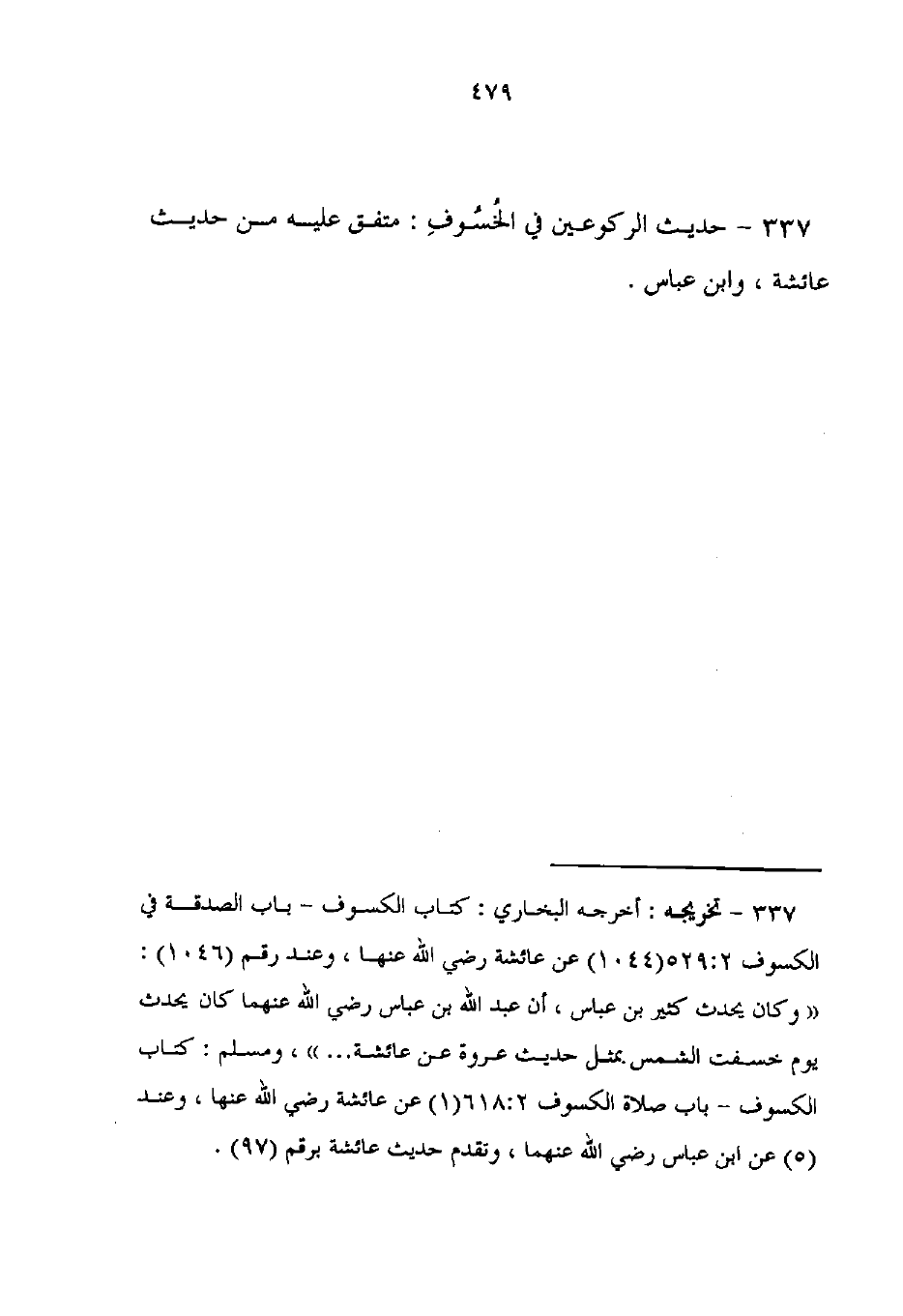 337 - حديث الركوعين في الخُسُوفِ: متفق عليه من حديث عائشة، وابن عباس.