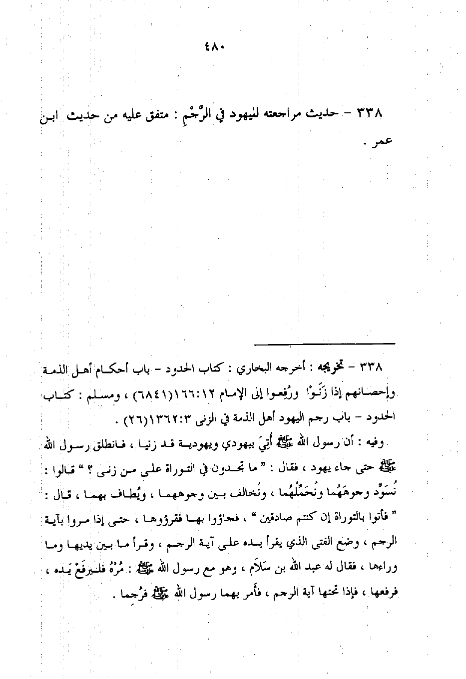 338 - تخريجه: أخرجه البخارى: كتاب الحدود - باب أحكام أهل الذمة وإحصانهم إذا زَنَوْا ورُفِعوا إلى الإمام 12: 166 (6841)، ومسلم: كتاب الحدود - باب رجم اليهود أهل الذمة في الزنى 3: 1362 (26).