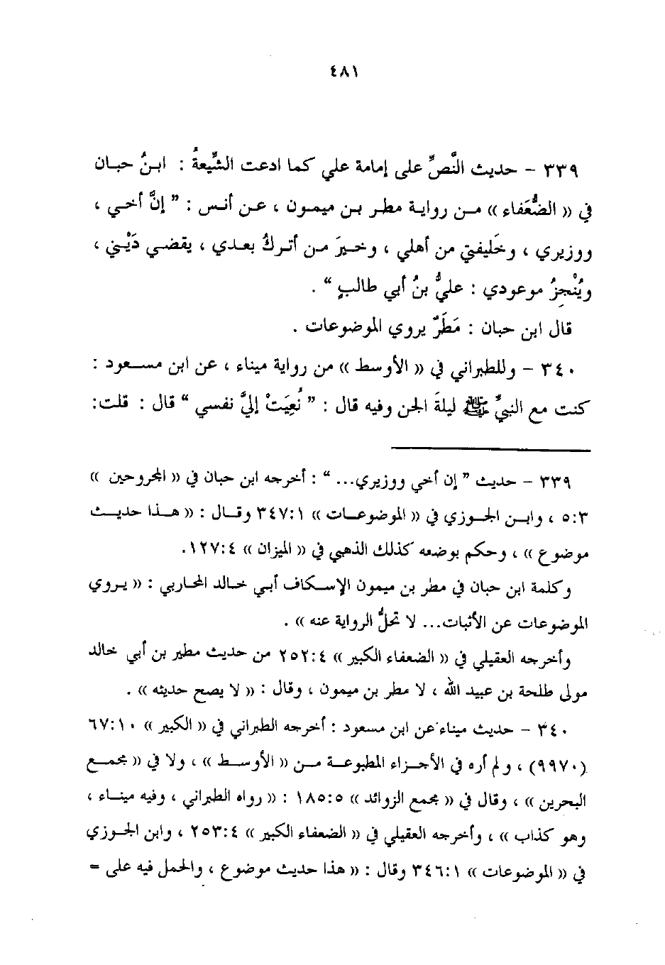 339 - حديث النَّصِّ على إمامة علي كما ادعت الشِّيعةُ: ابنُ حبان في "الضُّعَفاء" من رواية مطر بن ميمون، عن أنس: "إنَّ أخي، ووزيري، وخَليفتي من أهلي، وخيرَ من أتركُ بعدي، يقضي دَيْني، ويُنْجِزُ موعودي: عليُّ بنُ أبي طالبٍ".