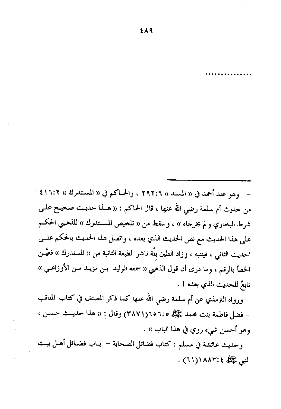 = وهو عند أحمد في "المسند" 6: 292، والحاكم في "المستدرك" 2: 416 من حديث أم سلمة رضي الله عنها، قال الحاكم: "هذا حديث صحيح على شرط البخاري ولم يخرجاه"، وسقط من "تلخيص المستدرك" للذهبي الحكم على هذا الحديث مع نص الحديث الذي بعده، واتصل هذا الحديث بالحكم على الحديث الثاني، فيتنبه، وزاد الطين بِلَّة ناشر الطبعة الثانية من "المستدرك" فعيَّن الخطأ بالرقم، وما درى أن قول الذهبي "سمعه الوليد بن مزيد من الأوزاعي" تابعٌ للحديث الذي بعده!.
