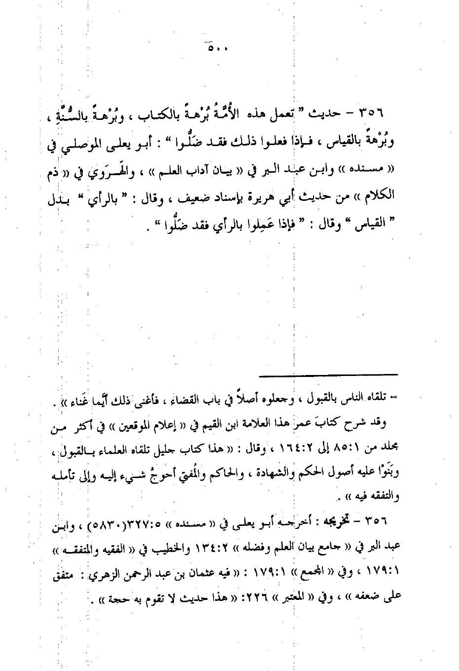 356 - حديث "تعمل هذه الأُمَّةُ بُرْهةً بالكتاب، وبُرْهةً بالسُّنَّةِ، وبُرْهةً بالقياس، فإذا فعلوا ذلك فقد ضَلُّوا": أبو يعلى الموصلي في "مسنده" وابن عبد البر في "بيان آداب العلم"، والهَرَوي في "ذم الكلام" من حديث أبي هريرة بإسناد ضعيف، وقال: "بالرأي" بدل "القياس" وقال: "فإذا عَمِلوا بالرأى فقد ضَلُّوا".