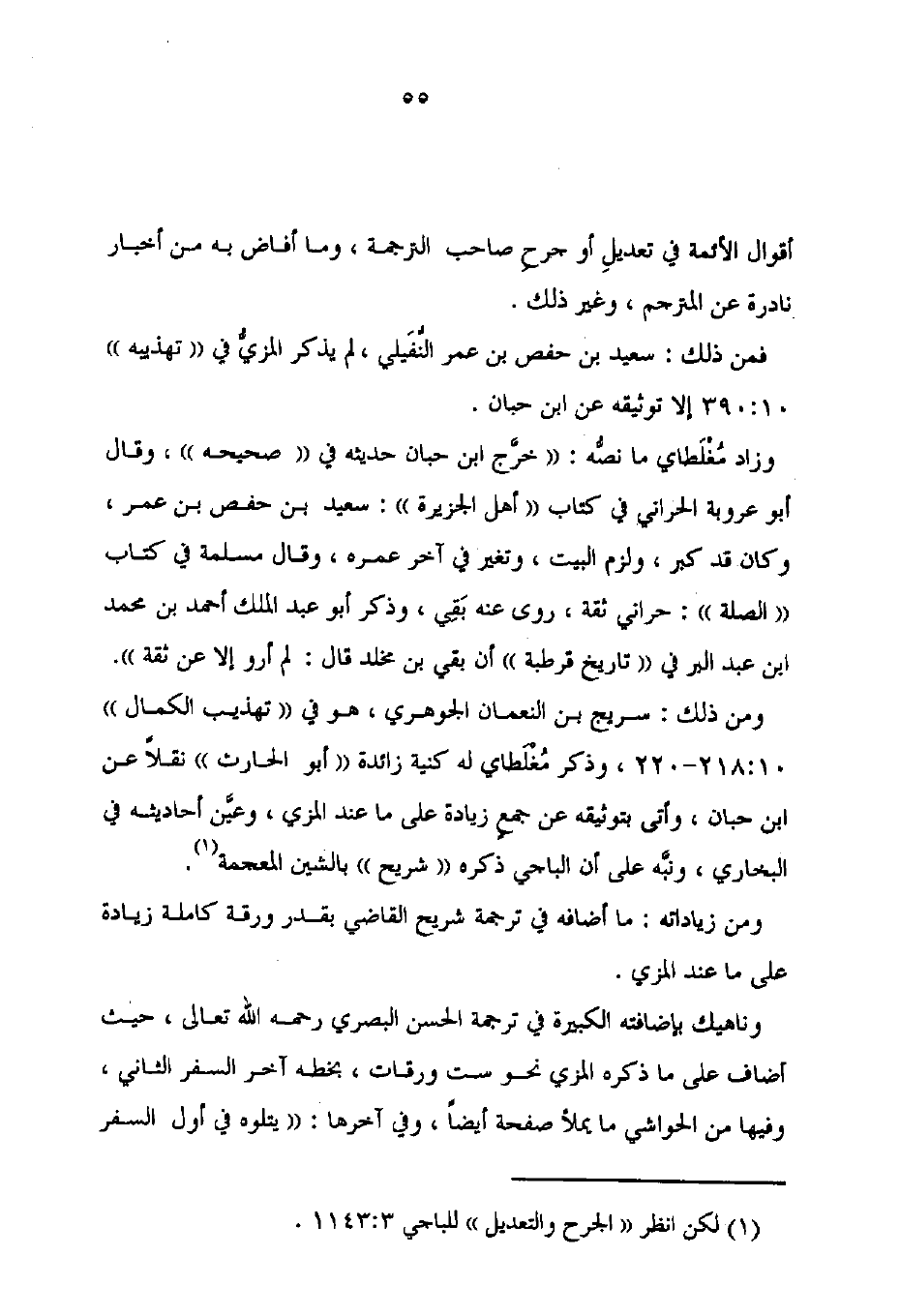 فمن ذلك: سعيد بن حفص بن عمر النُّفَيلي، لم يذكر المزيُّ في "تهذيبه" 10: 390 إلَّا توثيقه عن ابن حبان.