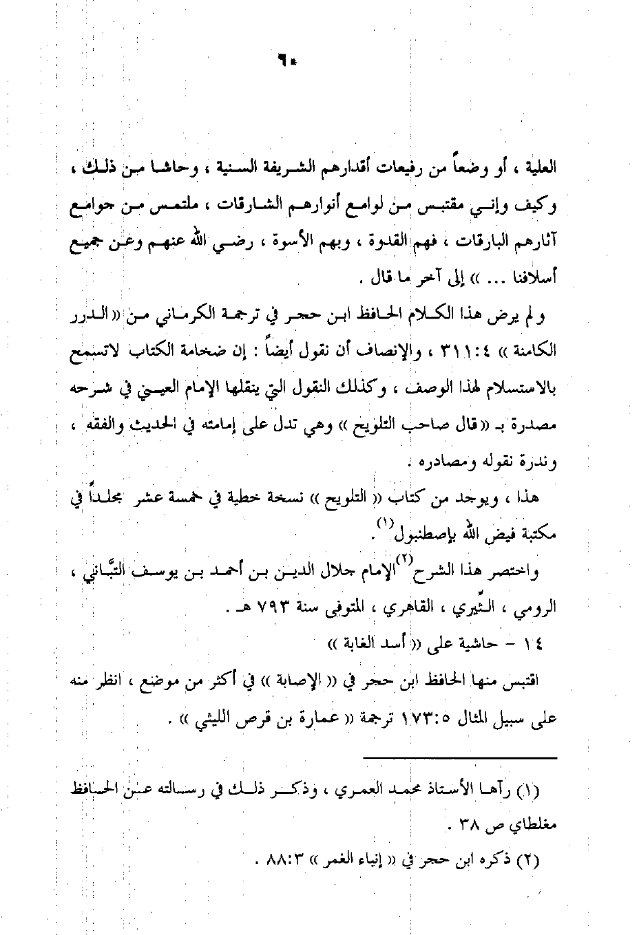 ولم يرض هذا الكلام الحافظ ابن حجر في ترجمة الكرماني من "الدرر الكامنة" 4: 311، والإنصاف أن نقول أيضًا: إن ضخامة الكتاب لا تسمح بالاستسلام لهذا الوصف، وكذلك النقول التي ينقلها الإِمام العيني في شرحه مصدرة بـ"قال صاحب التلويح" وهى تدل على إمامته في الحديث والفقه، وندرة نقوله ومصادره.