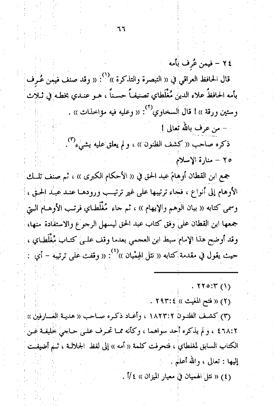 قال الحافظ العراقي في "التبصرة والتذكرة" (¬1): "وقد صنف فيمن عُرِف بأمه الحافظُ علاء الدين مُغْلَطاي تصنيفًا حسنًا، هو عندى بخطه في ثلاث وستين ورقة"! قال السخاوى (¬2): "وعليه فيه مؤاخذات".