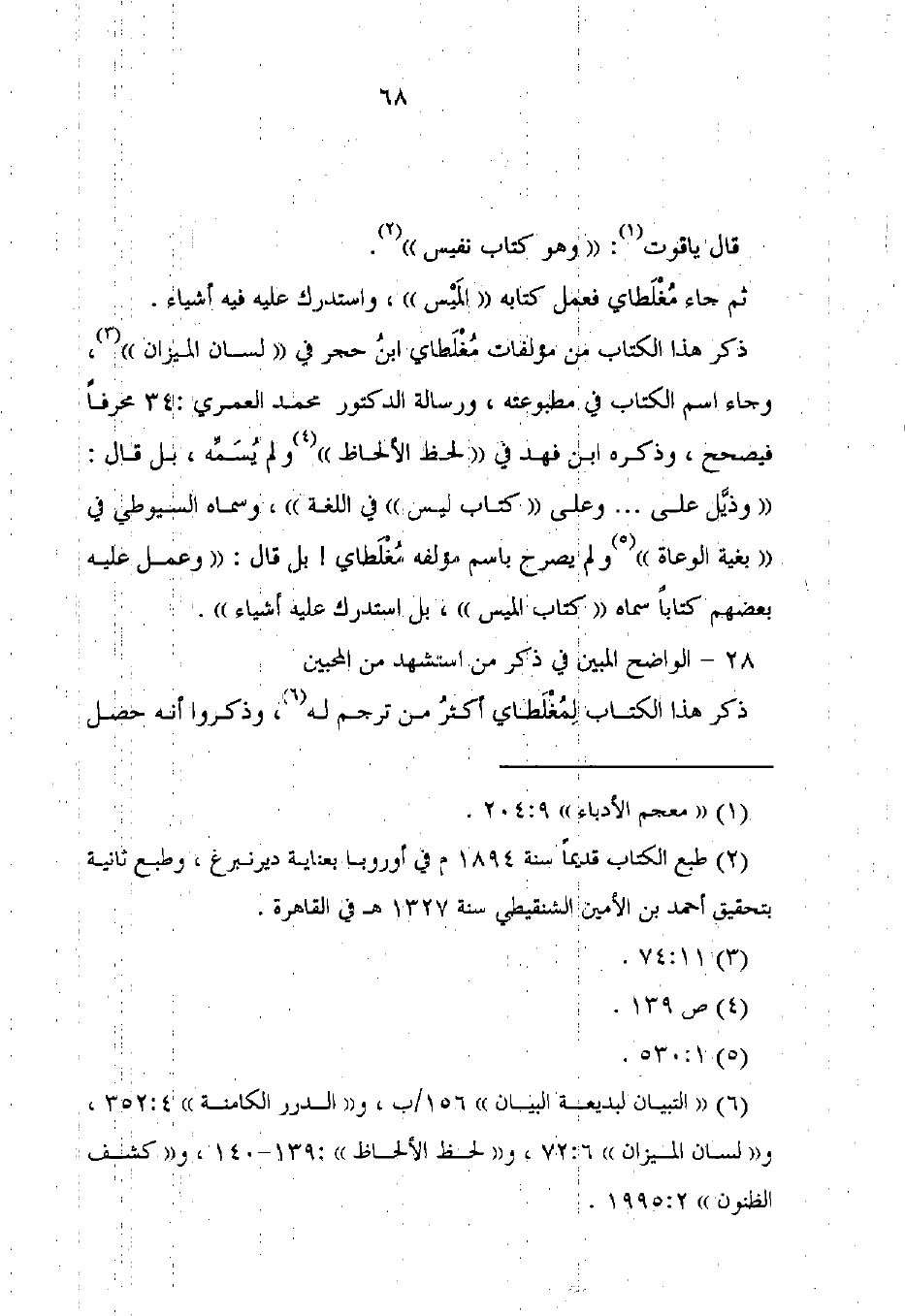 ذكر هذا الكتاب من مؤلفات مُغْلَطاي ابنُ حجر في "لسان الميزان" (¬3)، وجاء اسم الكتاب في مطبوعته، ورسالة الدكتور محمد العمرى: 34 محرفًا فيصحح، وذكره ابن فهد في "لحظ الألحاظ" (¬4) ولم يُسَمِّه، بل قال: "وذيُّل على. . . وعلى "كتاب ليس" في اللغة"، وسماه السيوطي في "بغية الوعاة" (¬5) ولم يصرح باسم مؤلفه مُغْلَطاي! بل قال: "وعمل عليه بعضهم كتابًا سماه "كتاب الميس"، بل استدرك عليه أشياء".