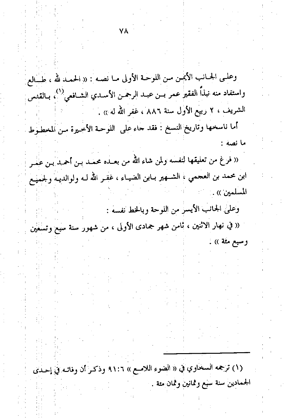 وعلى الجانب الأيمن من اللوحة الأولى ما نصه: "الحمد لله، طالع واستفاد منه نبذًا الفقير عمر بن عبد الرحمن الأسدي الشافعي (¬1)، بالقدس الشريف، 2 ربيع الأول سنة 886، غفر الله له".