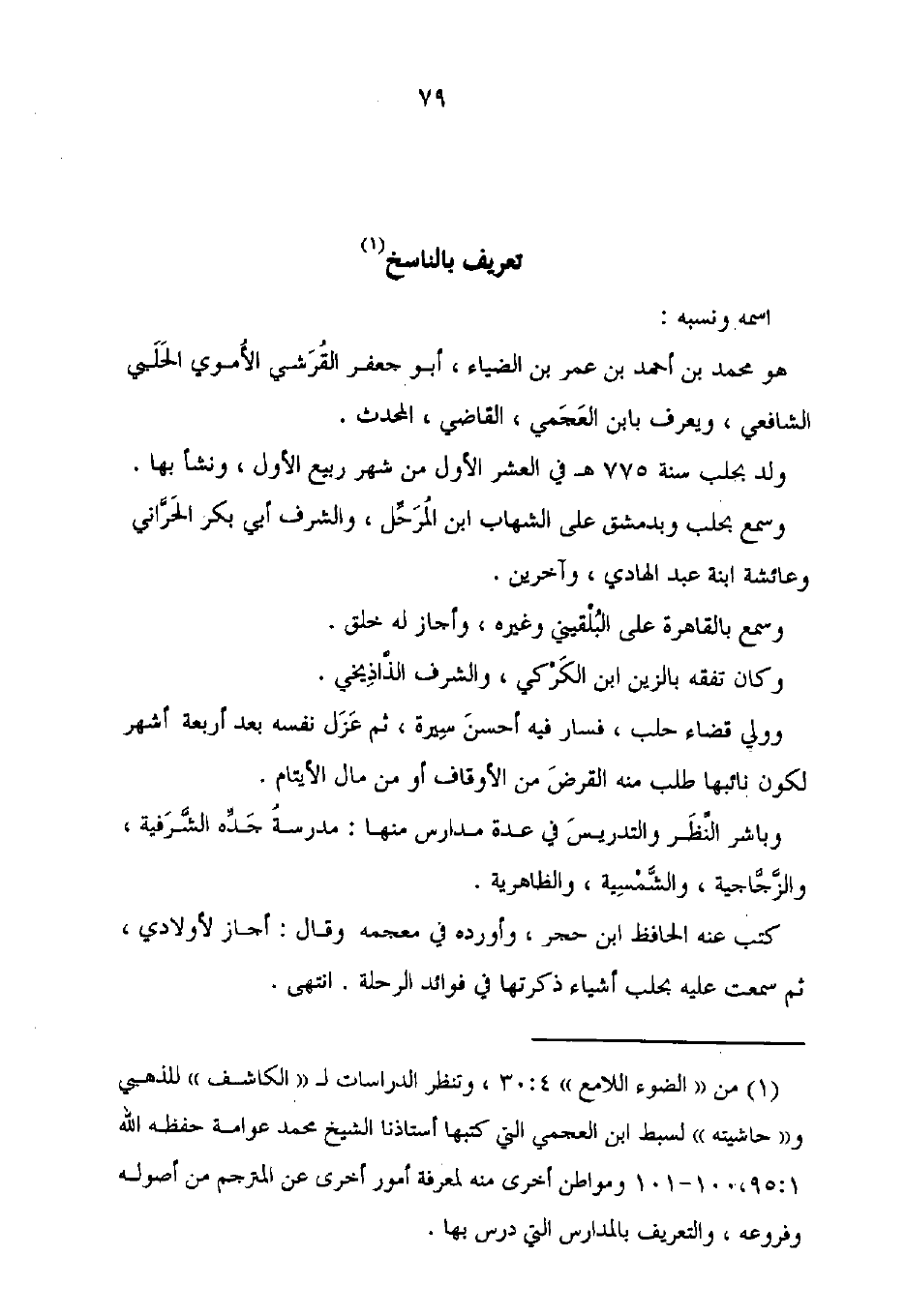 (¬1) من "الضوء اللامع" 4: 30، وتنظر الدراسات لـ"الكاشف" للذهبي و"حاشيته" لسبط ابن العجمي التي كتبها أستاذنا الشيخ محمد عوامة حفظه الله 1: 95، 100 - 101 ومواطن أخرى منه لمعرفة أمور أخرى عن المترجم من أصوله وفروعه، والتعريف بالمدارس التي درس بها.