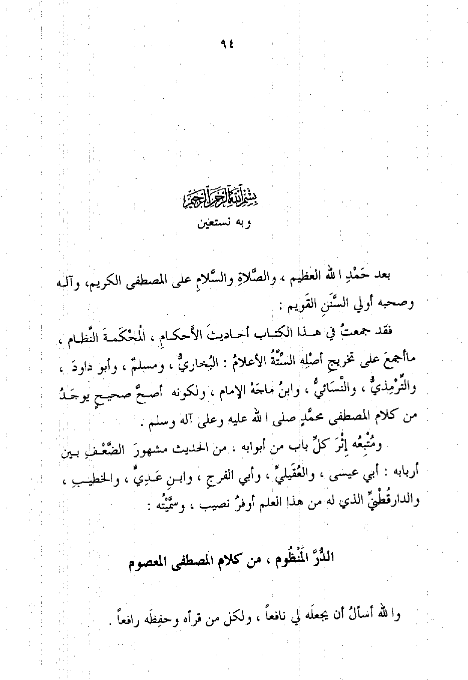 فقد جمعتُ في هذا الكتاب أحاديثَ الأَحكامِ، المُحْكَمةَ النِّظام، ما أجمعَ على تخريج أصْلِه السِّتة الأعلامُ: البُخاري، ومسلم، وأبو داودَ، والتِّرْمِذي، والنسَائي، وابنُ ماجَهْ الإمام، ولكونه أصح صحيح يوجَدُ من كلام المصطفى محمدٍ صَلَّى الله عليه وعلى آله وسلم.