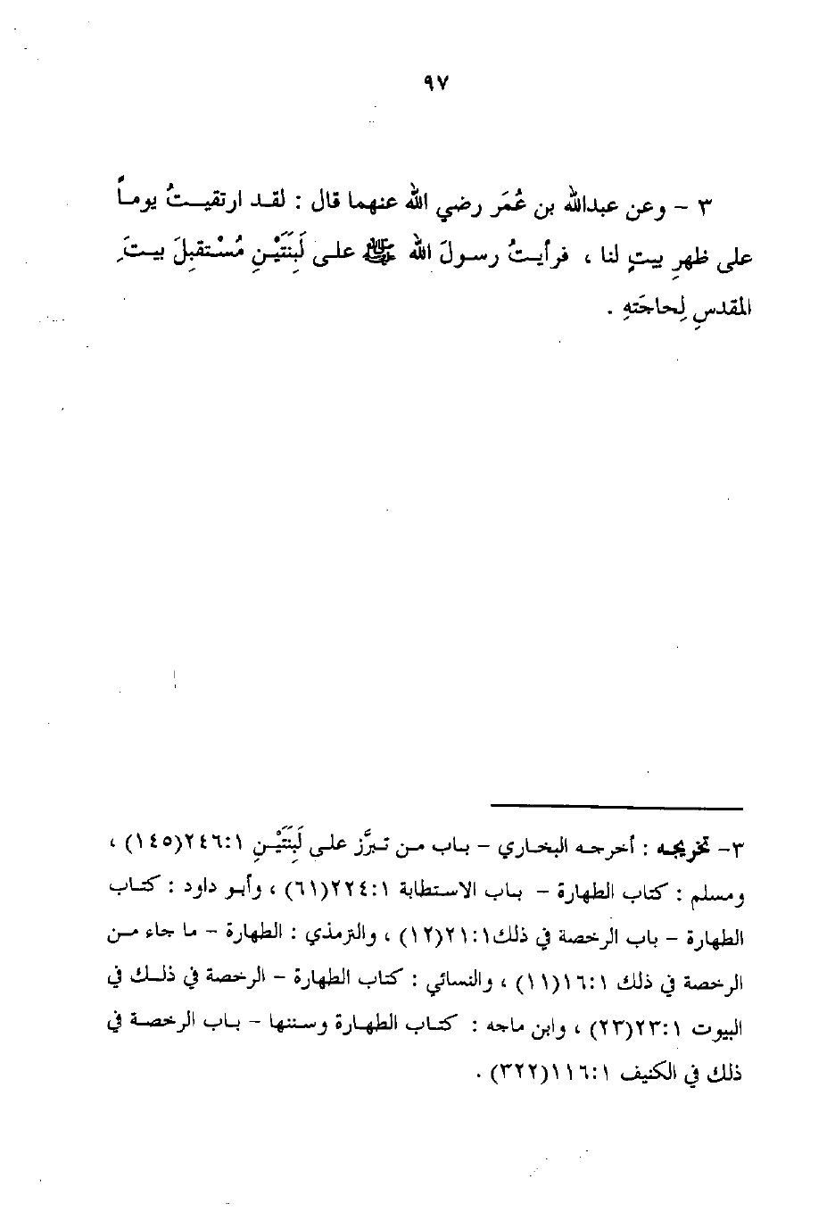 3 - تخريجه: أخرجه البخاري - باب من تبرَّز على لَبِنَتَيْنِ 1: 246 (145)، ومسلم: كتاب الطهارة - باب الاستطابة 1: 224 (61)، وأبو داود: كتاب الطهارة - باب الرخصة في ذلك 1: 21 (12)، والترمذي: الطهارة - ما جاء من الرخصة في ذلك 1: 16 (11)، والنسائي: كتاب الطهارة - الرخصة في ذلك في البيوت 1: 23 (23)، وابن ماجه: كتاب الطهارة وسننها - باب الرخصة في ذلك في الكنيف 1: 116 (322).