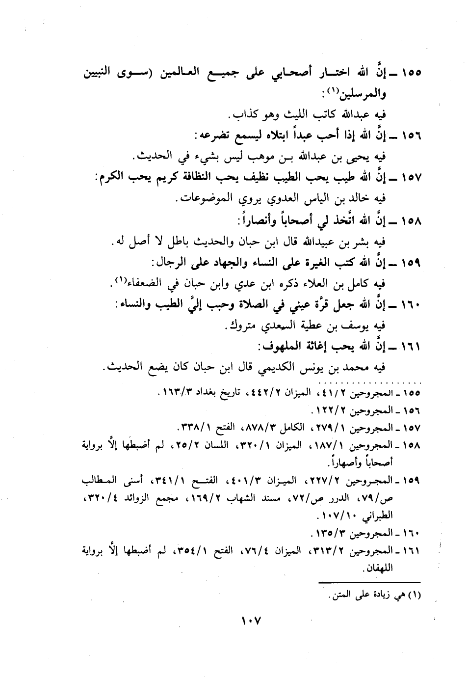 155 - إِن الله اخْتَار أَصْحَابِي على جَمِيع الْعَالمين (سوى النبيبن وَالْمُرْسلِينَ) : فِيهِ عبد الله كَاتب اللَّيْث وَهُوَ كَذَّاب.