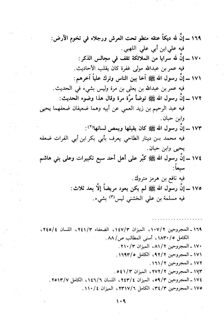169 - إِن لله ديكا عُنُقه منطو تَحت الْعَرْش وَرجلَاهُ فِي تخوم الأَرْض: فِيهِ عَليّ ابْن أبي عَليّ اللهبي.
