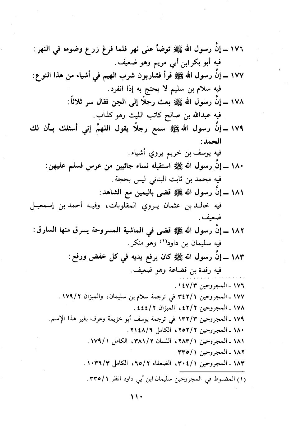 178 - إِن رَسُول الله صلى الله عَلَيْهِ وَسلم بعث رجلا إِلَى الْجِنّ فَقَالَ سر ثَلَاثًا: فِيهِ عبد الله بن صَالح كَاتب اللَّيْث وَهُوَ كَذَّاب.