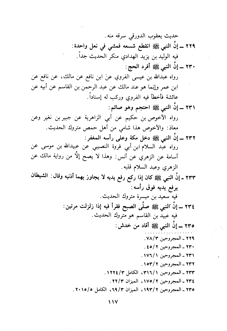 229 - إِن النَّبِي صلى الله عَلَيْهِ وَسلم انْقَطع شسعه فمشي فِي نعل وَاحِدَة: فِيهِ الْوَلِيد بن يزِيد الهدادي مُنكر الحَدِيث جدا.