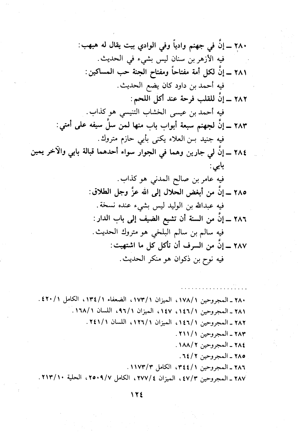 280 - إِن فِي جَهَنَّم وَاديا وَفِي الْوَادي بَيت يُقَال لَهُ هبهب: فِيهِ الْأَزْهَر بن سِنَان لَيْسَ بِشَيْء فِي الحَدِيث.
