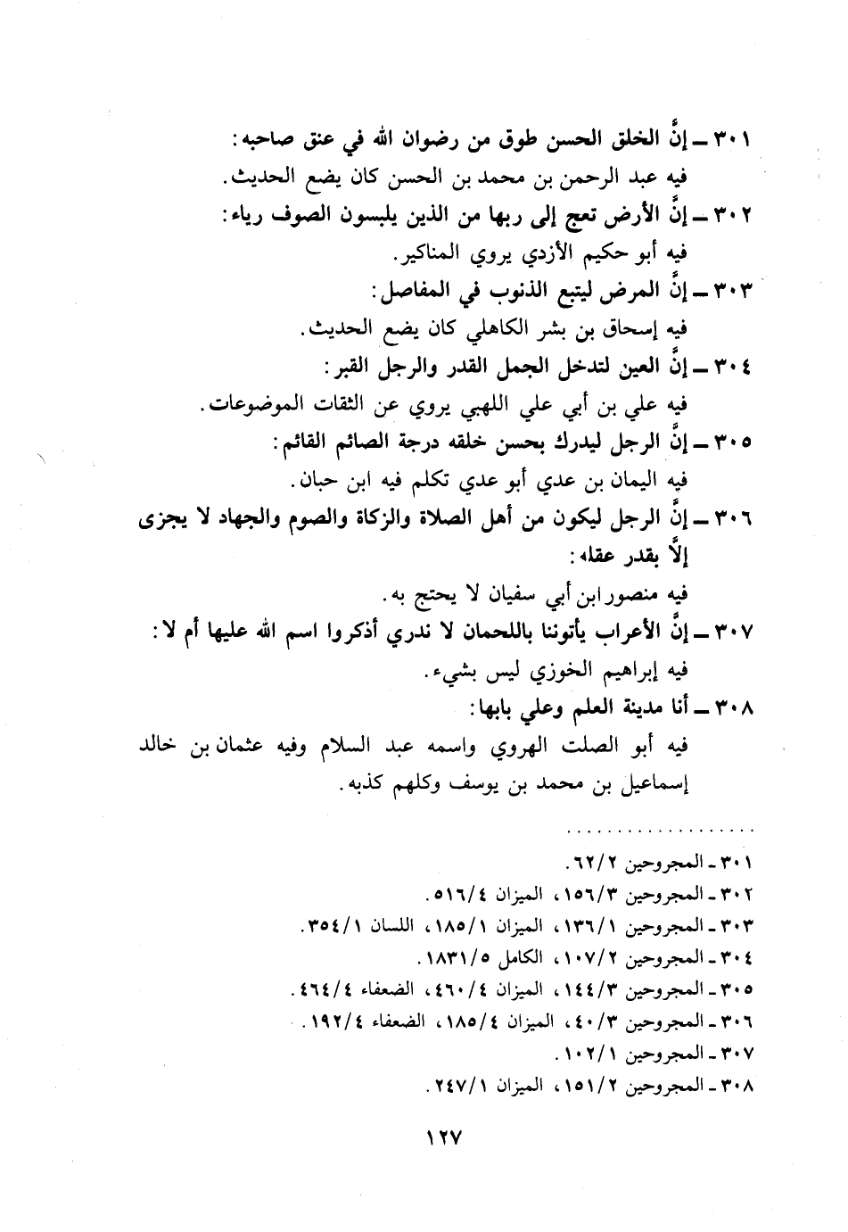 306 - إِن الرجل ليَكُون من أهل الصَّلَاة وَالزَّكَاة وَالصَّوْم وَالْجهَاد لَا يجزى إِلَّا بِقدر عقله: فِيهِ مَنْصُور ابْن أبي سُفْيَان لَا يحْتَج بِهِ.