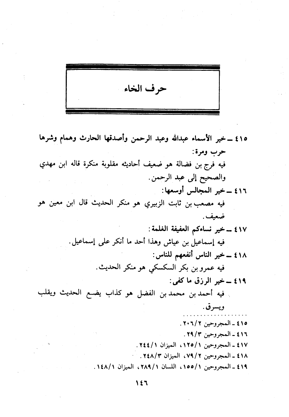 415 - خير الْأَسْمَاء عبد الله وَعبد الرَّحْمَن وَأصْدقهَا الْحَارِث وَهَمَّام وشرها حَرْب وَمرَّة: فِيهِ فرج بن فضَالة هُوَ ضَعِيف أَحَادِيثه مَقْلُوبَة مُنكرَة قَالَه ابْن مهْدي وَالصَّحِيح إِلَى عبد الرَّحْمَن.