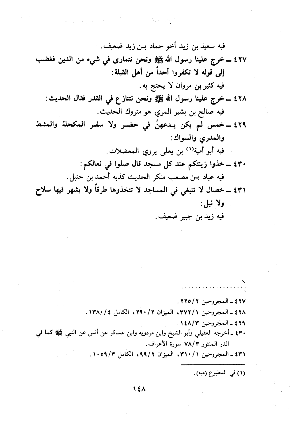 430 - خُذُوا زينتكم عِنْد كل مَسْجِد قَالَ صلوا فِي نعالكم: فِيهِ عباد بن مُصعب مُنكر الحَدِيث كذبه أَحْمد بن حَنْبَل.