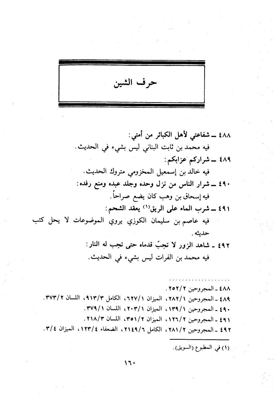 489 - شِرَاركُمْ عُزَّابُكُمْ: فِيهِ خَالِد بن إِسْمَاعِيل المَخْزُومِي مَتْرُوك الحَدِيث.