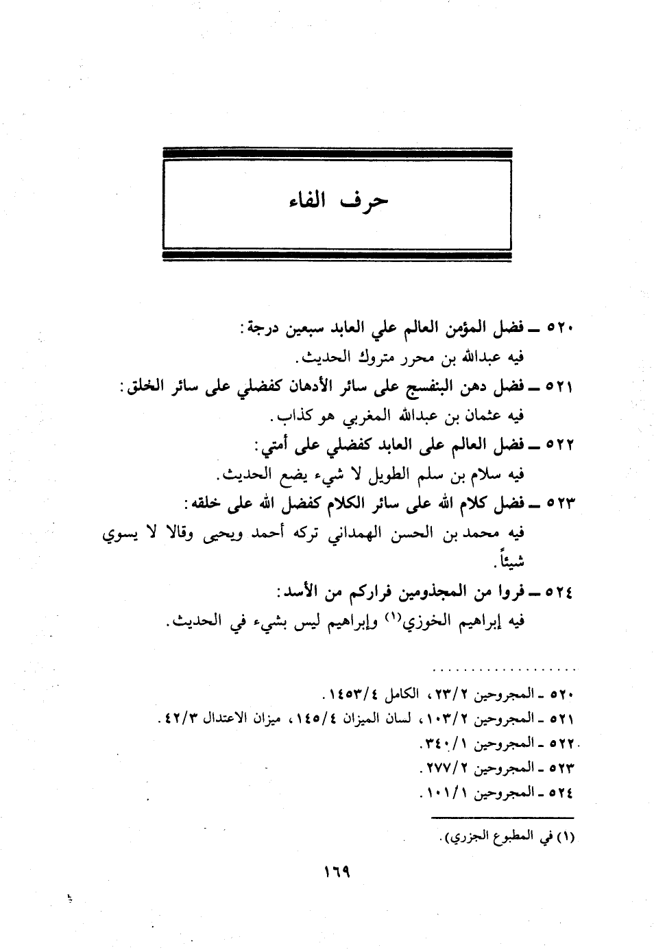 520 - فضل الْمُؤمن الْعَالم على العابد سبعين دَرَجَة: فِيهِ عبد الله بن مُحَرر مَتْرُوك الحَدِيث.