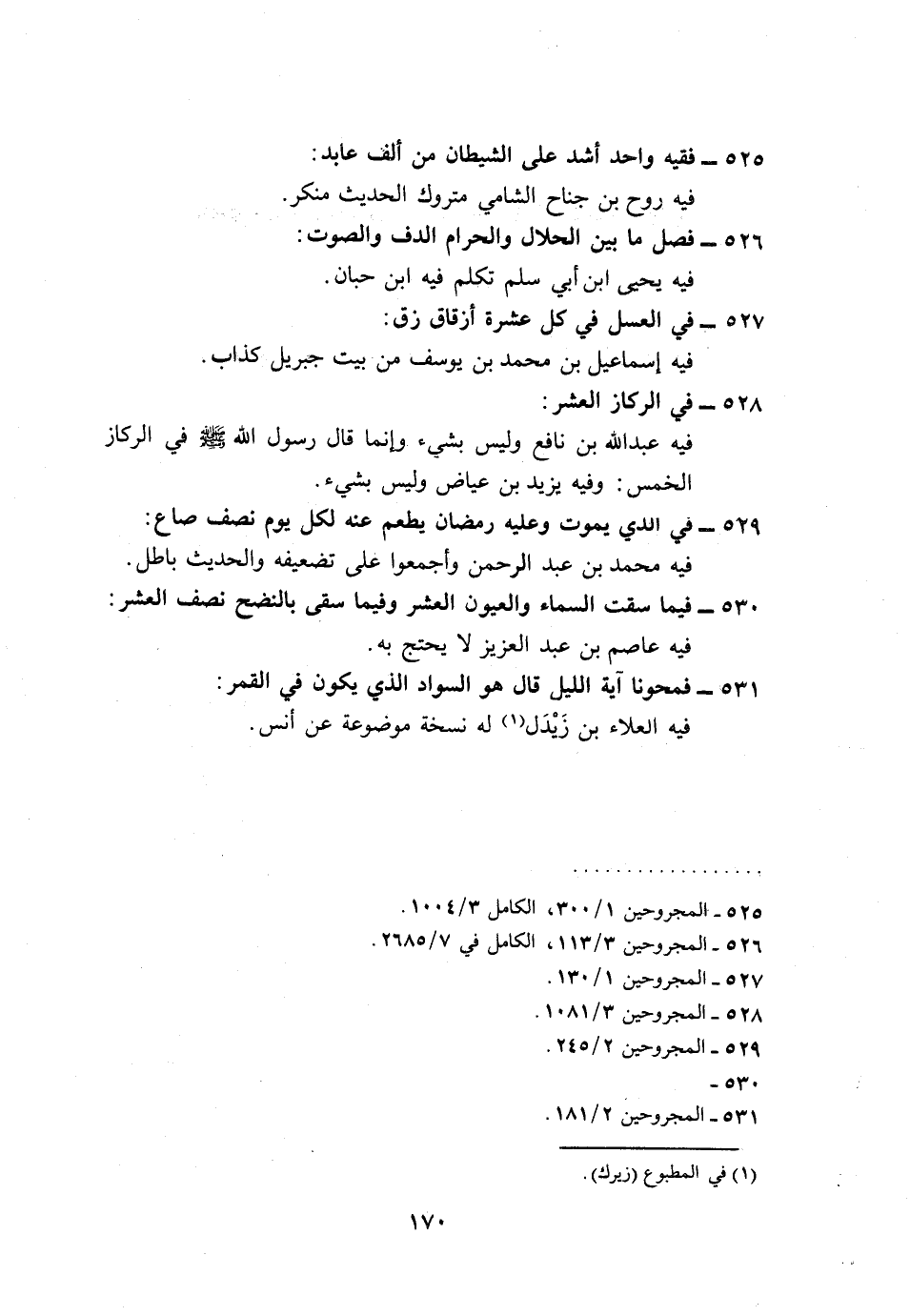 525 - فَقِيه وَاحِد أَشد على الشَّيْطَان من ألف عَابِد: فِيهِ روح بن جنَاح الشَّامي مَتْرُوك الحَدِيث مُنكر.