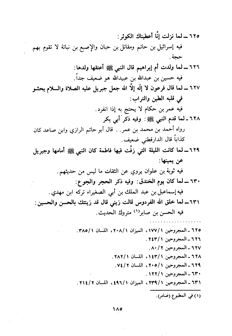 625 - لما نزلت إِنَّا أعطيناك الْكَوْثَر: فِيهِ إِسْرَائِيل بن حَاتِم وَمُقَاتِل بن حبَان والإصبع بن نباتة لَا تقوم بهم حجَّة.