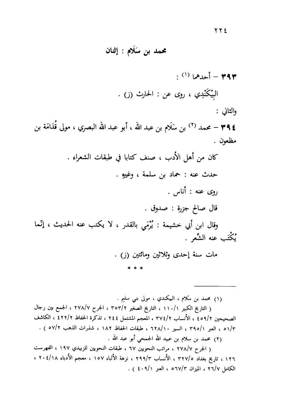 394 - مُحَمَّد بن سَلام بن عبد الله أَبُو عبد الله الْبَصْرِيّ مولى قدامَة بن مَظْعُون