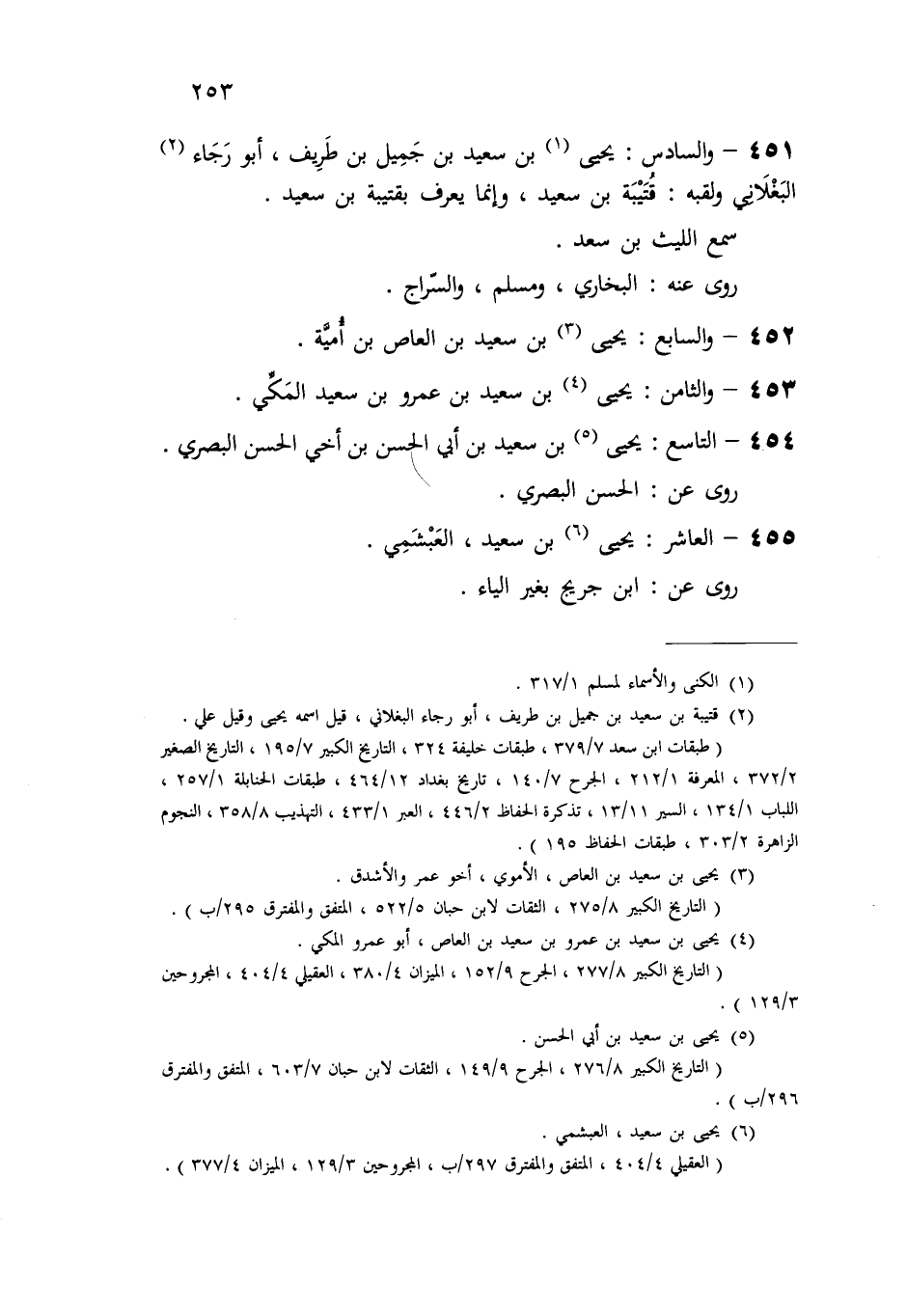 451 - وَالسَّادِس يحيى بن سعيد بن جميل بن طريف أَبُو رَجَاء البغلاني ولقبه قُتَيْبَة بن سعيد وَإِنَّمَا يعرف بقتيبة بن سعيد
