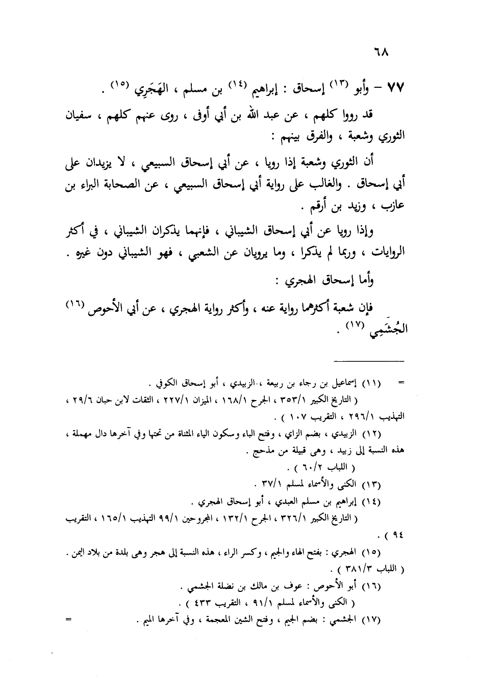 أَن الثَّوْريّ وَشعْبَة إِذا رويا عَن أبي إِسْحَاق السبيعِي لَا يزيدان على أبي إِسْحَاق وَالْغَالِب على رِوَايَة أبي إِسْحَاق السبيعِي عَن الصَّحَابَة الْبَراء بن عَازِب وَزيد بن أَرقم