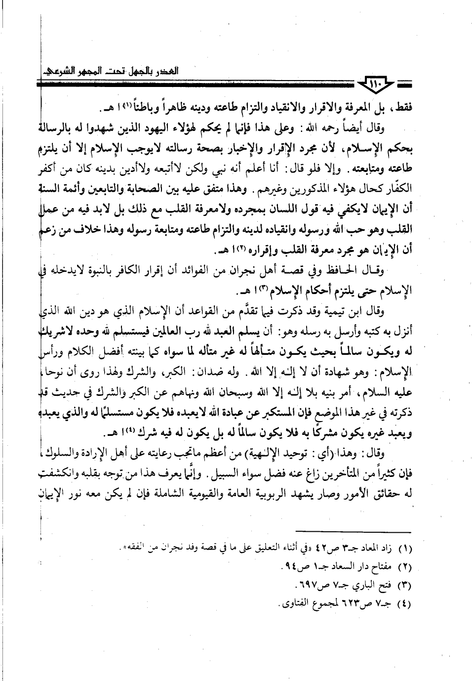 وقال: وهذا (أي: توحيد الإلهية) من أعظم ما تجب رعايته على أهل الإرادة والسلوك، فإن كثيراً من المتأخرين زاغ عنه فضل سواء السبيل. وإنما يعرف هذا من توجه بقلبه وانكشفت له حقائق الأمور وصار يشهد الربوبية العامة والقيومية الشاملة فإن لم يكن معه نور الإيمان