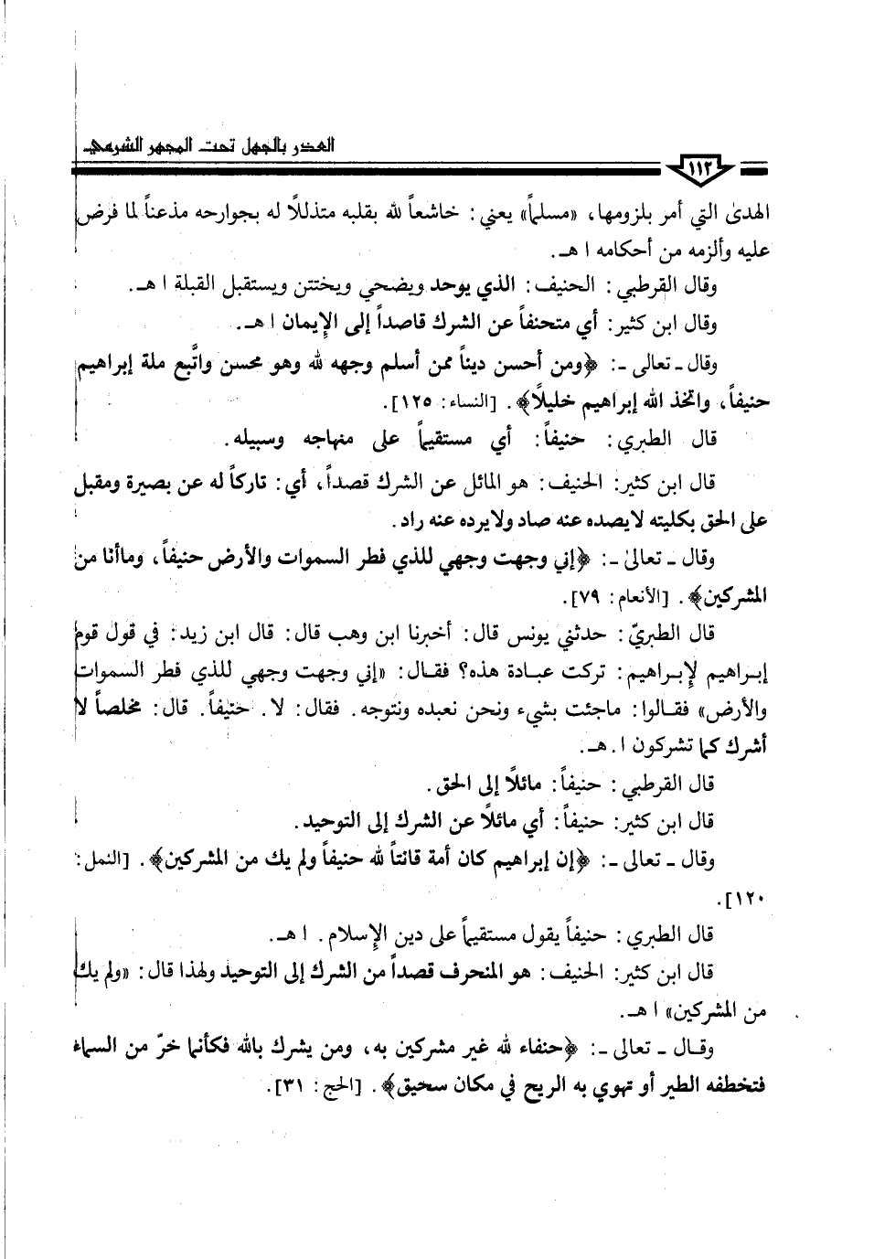 قال ابن كثير: الحنيف: هو المائل عن الشرك قصداً، أي: تاركاً له عن بصيرة ومقبل على الحق بكليته لا يصده عنه صاد ولا يرده عنه راد.