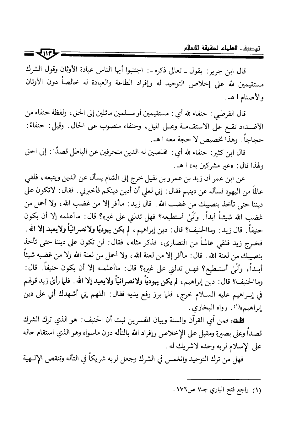 قلت: فمن آي القرآن والسنة وبيان المفسرين ثبت أن الحنيف: هو الذي ترك الشرك قصداً وعلى بصيرة ومقبل على الإخلاص وإفراد الله بالتأله دون ما سواه وهو الذي استقام حاله على الإسلام لربه وحده لا شريك له.